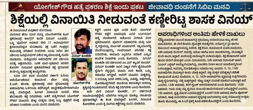 ಧಾರವಾಡ ಜಿಲ್ಲಾ ಪಂಚಾಯಿತಿ ಸದಸ್ಯ ಯೋಗೇಶ್ ಗೌಡ ಪ್ರಕರಣದಲ್ಲಿ ಕಾಂಗ್ರೆಸ್ ಶಾಸಕ ವಿನಯ್ ಕುಲಕರ್ಣಿ ಒಬ್ಬ ಪೊಲೀಸ್ ಅಧಿಕಾರಿ ಸೇರಿ 17 ಅಪರಾಧಿಗಳಿಗೆ ಕ್ಷಮಾದಾನವಿಲ್ಲದ ಜೀವಾವಧಿ ಶಿಕ್ಷೆ …