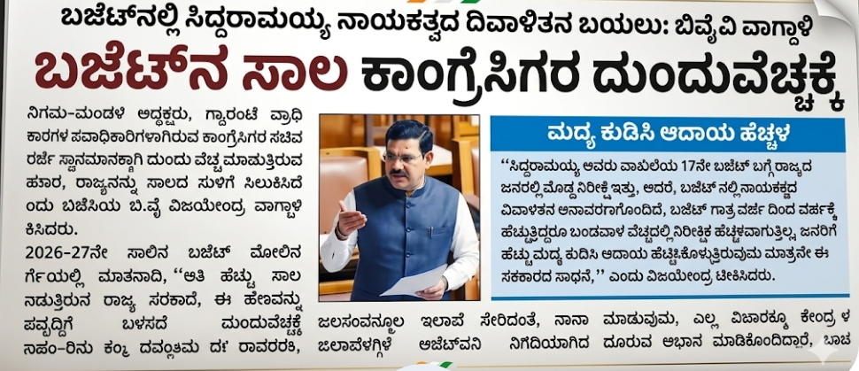 -))ಸಿದ್ದರಾಮಯ್ಯ ಅವರು ದಾಖಲೆಯ 17ನೇ ಬಜೆಟ್ ಬಗ್ಗೆ ರಾಜ್ಯದ ಜನರಲ್ಲಿ ದೊಡ್ಡ ನಿರೀಕ್ಷೆ ಇತ್ತು ಆದರೆ ಬಜೆಟ್ ನಲ್ಲಿ ನಾಯಕತ್ವದ ದಿವಾಳಿ ತನ ಅನಾವರಣಗೊಂಡಿದೆ ಬಜೆಟ್ ಗಾತ್ರದ ವರ್ಷದಿಂದ ವರ್ಷಕ್ಕೆ ಹೆಚ್ಚುತ್ತಿದ್ದರು ಬಂಡವಾಳ ವೆಚ್ಚದಲ್ಲಿ ನಿರೀಕ್ಷಿತ ಹೆಚ್ಚಳವಾಗುತ್ತಿಲ್ಲ ಜನರಿಗೆ ಹೆಚ್ಚು ಮಧ್ಯ ಕುಡಿಸಿ ಆದಾಯ ಹೆಚ್ಚಿಸಿಕೊಳ್ಳುತ್ತಿದ್ದರು ಮಾತ್ರವೇ ಈ ಸರ್ಕಾರದ ಸಾಧನೆ ಎಂದು ವಿಜಯೇಂದ್ರ ಟೀಕಿಸಿದ್ದರು .